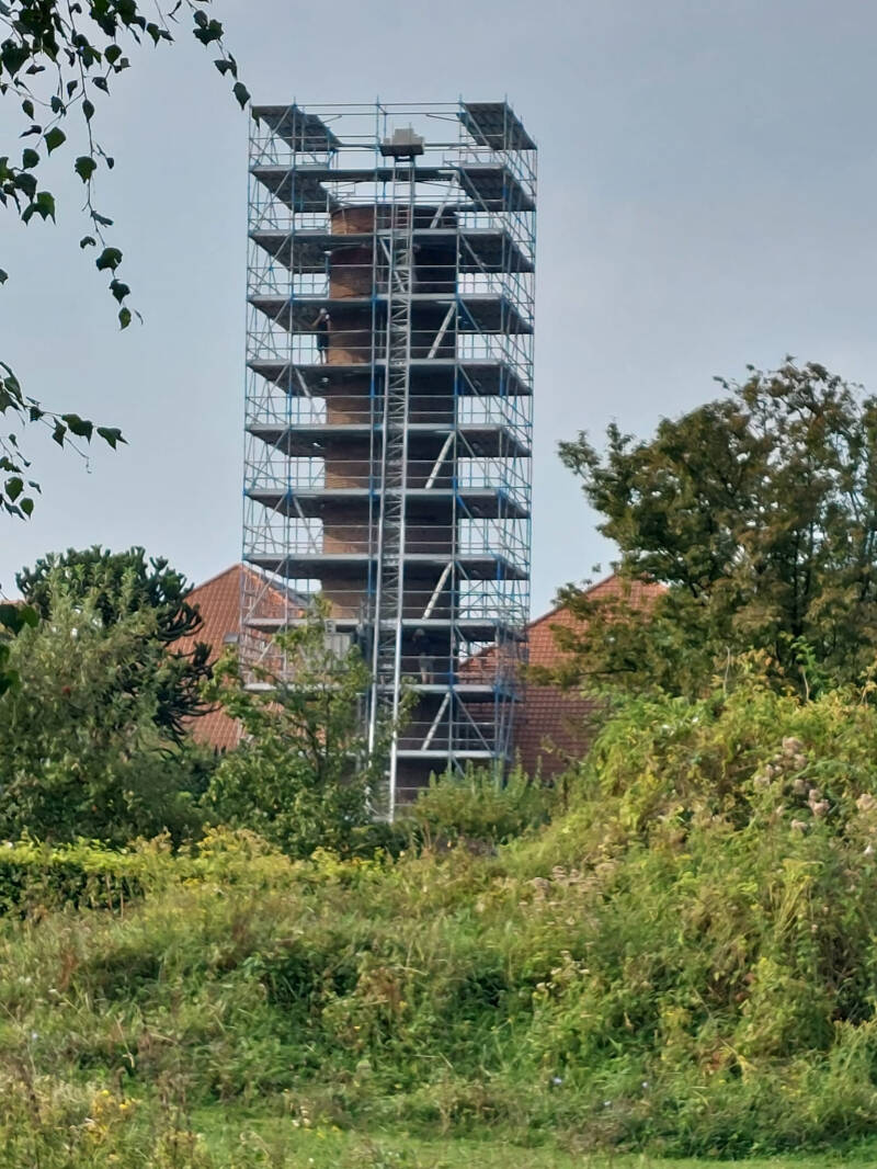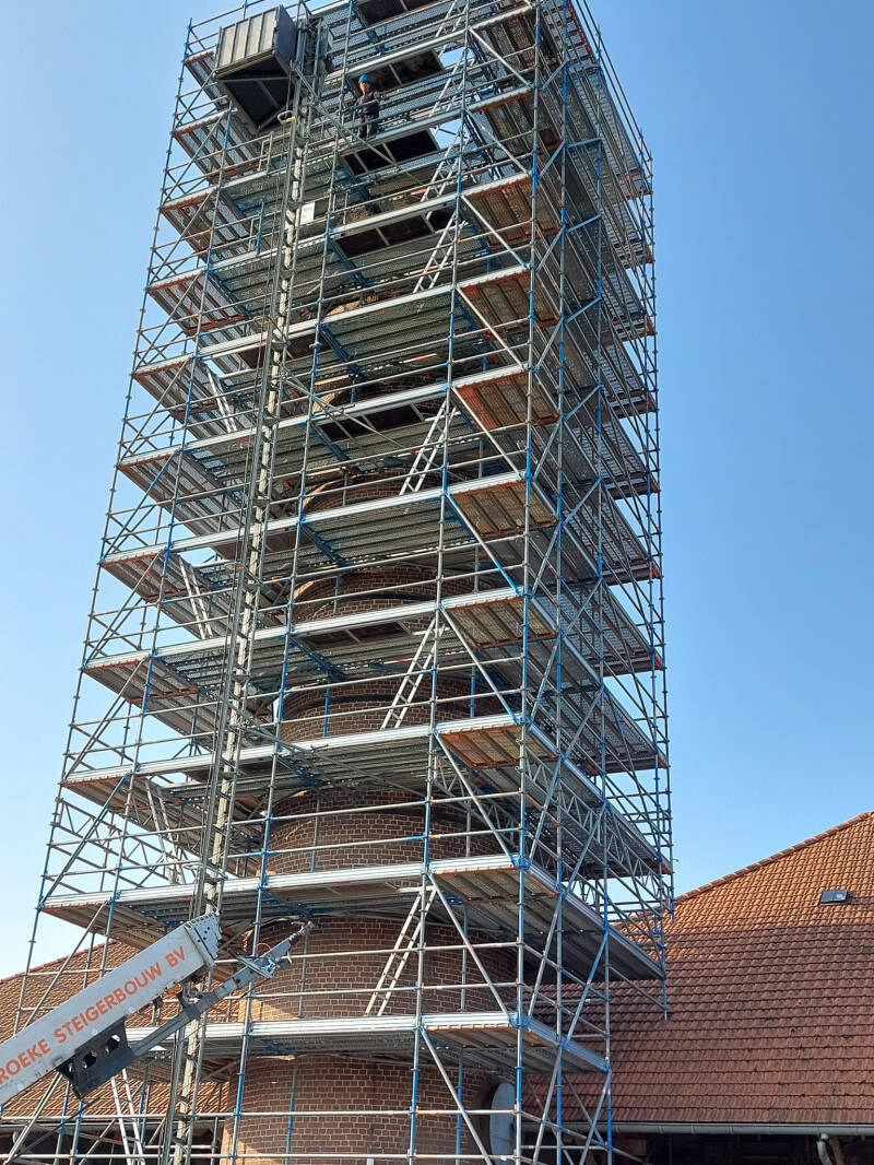 De twee atriums zijn voorzien van plantenbakken met beplanting. De balustrades van glas zijn geplaatst. Steigerwerk is geplaatst rondom de schoorsteen, om te kunnen starten met het metselen van de ophoging van de bestaande schoorsteen.